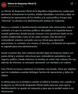 En esa lógica, la Oficina se presenta como un canal directo para que la ciudadanía contraste versiones y tenga una postura institucional cuando circulan recortes, titulares o interpretaciones que distorsionan medidas, decisiones o cifras oficiales. Medios nacionales describieron que la dinámica apunta a una respuesta rápida y a intervenir cuando un tema se instala fuerte en redes.