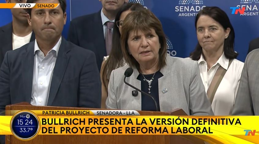 El Gobierno nacional presentó este martes el proyecto de reforma laboral que será debatido este miércoles en el Senado de la Nación. La iniciativa fue anunciada en conferencia de prensa por la presidenta del bloque de La Libertad Avanza, Patricia Bullrich, quien destacó la amplitud del acuerdo político alcanzado para avanzar con la norma.